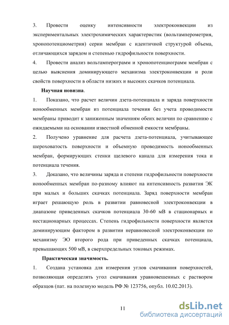 Научная новизна. Показано, что расчет величин дзета-потенциала и заряда поверхности ионообменных мембран из потенциала течения без учета проводимости мембраны приводит к заниженным значениям обеих величин по сравнению с ожидаемыми на основании известной обменной емкости мембраны.