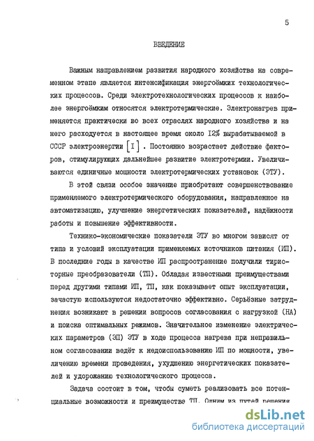 Важным направлением развития народного хозяйства на современном этапе является интенсификация энергоёмких технологических процессов. Среди электротехнологических процессов к наиболее энергоёмким относятся электротермические. Электронагрев применяется практически во всех отраслях народного хозяйства и на него расходуется в настоящее время около 12$ вырабатываемой в СССР электроэнергии [i] . Постоянно возрастает действие факторов, стимулирующих дальнейшее развитие электротермии. Увеличиваются единичные мощности электротермических установок (ЭТУ).