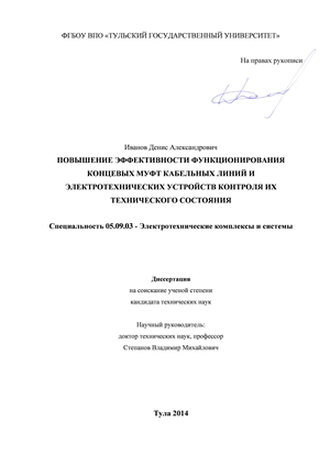Диссертация представляет собой законченную научно квалификационную работу, в которой поставлена и решена задача обоснования рациональных параметров контроля технического состояния концевых муфт, установления зависимостей для обеспечения требуемого уровня совместимости электротехнических устройств контроля технического состояния и элементов концевых муфт, учитывающих в комплексе факторы изменения температуры, сопротивления, толщины изоляции для повышения эффективности контроля технического состояния концевых муфт кабельных линий.