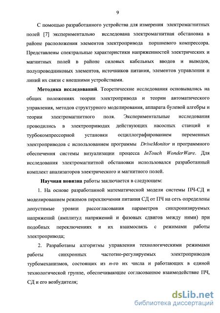 Результаты теоретических и экспериментальных исследований разработанных алгоритмов и систем управления синхронными частотно-регулируемыми электроприводами турбомеханизмов, их энергетических режимов работы и спектральных характеристик напряженностей электрического и магнитного полей в районе расположения элементов управления и силовой части электроприводов турбомеханизмов.