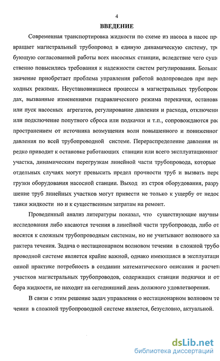 Современная транспортировка жидкости по схеме из насоса в насос пр< вращает магистральный трубопровод в единую динамическую систему, тр( бующую согласованной работы всех насосных станции, вследствие чего сущ< ственно повысились требования к надежности систем регулирования. Больше значение приобретает проблема управления работой водопроводов при пер< ходных режимах. Неустановившиеся процессы в магистральных трубопров( дах, вызванные изменениями гидравлического режима перекачки, останов» или пуск насосных агрегатов, регулирование давления и расхода, отключени или подключение попутного сброса или подкачки и т.п., сопровождаются рас пространением от источника возмущения волн повышенного и пониженног давления по всей трубопроводной системе. Перераспределение давления не редко приводит к остановке работающих станции или всего эксплуатационног участка, динамическим перегрузкам линейной части трубопровода, которые отдельных случаях могут превысить предел прочности труб и вызвать пере грузки оборудования насосной станции. Выход из строя оборудования, разр^ шение труб линейных участков могут привести не только к ущербу от недос тавки жидкости но и к существенным затратам на ремонт.
