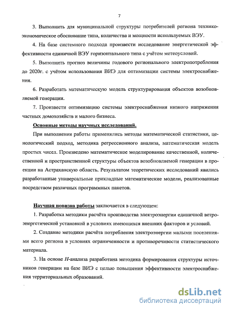 Методы научных исследований. При выполнении работы применялись методы математической статистики, ценологический подход, методика регрессионного анализа, математическая модель простых чисел. Произведено математическое моделирование качественной, количественной и пространственной структуры объектов возобновляемой генерации региона. Результатом теоретических исследований явились разработанные универсальные прикладные математические модели, реализованные посредством разных программных пакетов.