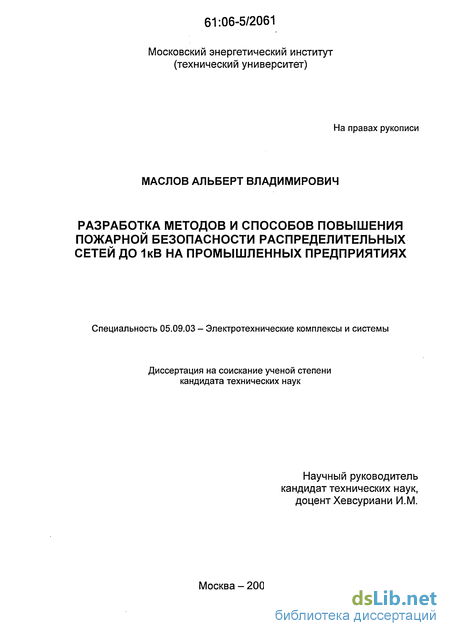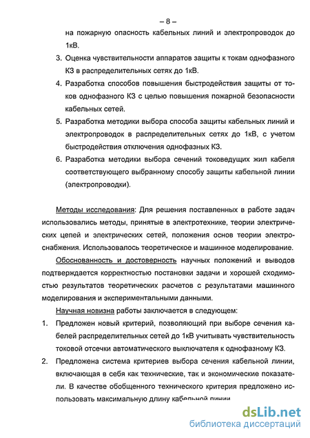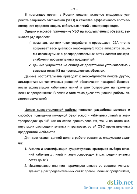 Целью диссертационной работы является разработка методов и способов повышения пожарной безопасности кабельных линий и электропроводок до 1кВ как на этапе проектирования, так и на этапе эксплуатации распределительных и групповых сетей СЭС промышленных предприятий и объектов.
