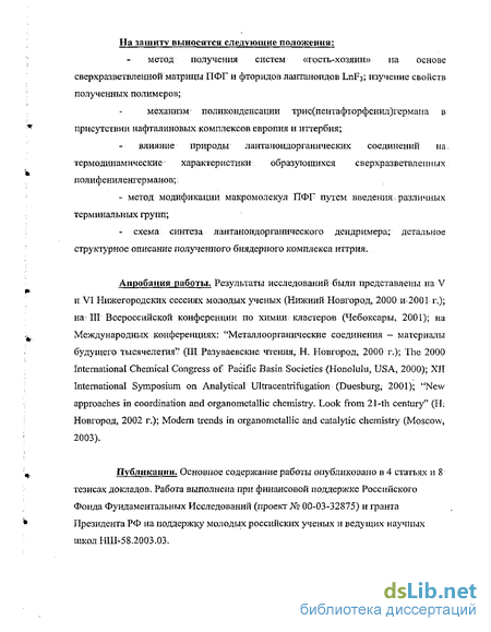 На зашиту выносятся следующие положения: метод получения систем «гость-хозяин» на основе сверхразветвленной матрицы ПФГ и фторидов лантаноидов L11F3; изучение свойств полученных полимеров; механизм поликонденсации трис(пентафторфенил)германа в присутствии нафталиновых комплексов европия и иттербия; влияние природы лантаноидорганических соединений на термодинамические характеристики образующихся сверхразветвленных полифенил енгерманов; - метод модификации макромолекул ПФГ путем введения, различных терминальных групп; - схема синтеза лантаноидорганического дсндримера; детальное структурное описание полученного биядерного комплекса иттрия.
