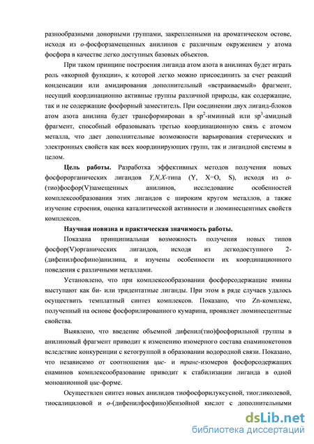 Цель работы. Разработка эффективных методов получения новых фосфорорганических лигандов Y,N,X типа (Y, Х=0, S), исходя из о-(тио)фосфор(У)замещенных анилинов, исследование особенностей комплексообразования этих лигандов с широким кругом металлов, а также изучение строения, оценка каталитической активности и люминесцентных свойств комплексов.