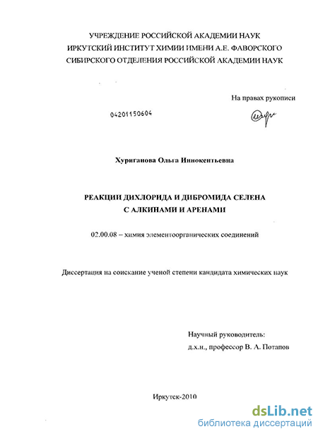 Апробация работы и публикации. По материалам диссертации опубликовано 10 работ, из них 4 статьи. Основные результаты представлены на XI Международной конференции по химии селена и теллура (Оулу, Финляндия, 2010), Международном симпозиуме по органической химии серы (Флоренция, Италия, 2010), Международной конференции по органической химии "Chemistry of Compounds with Multiple Carbon-Carbon Bonds" (Санкт-Петербург, 2008), Всероссийской конференции по органической химии (Москва, 2009) и Межрегиональной научно-практической конференции молодых ученых «Человек: здоровье и экология» (Иркутск, 2008).