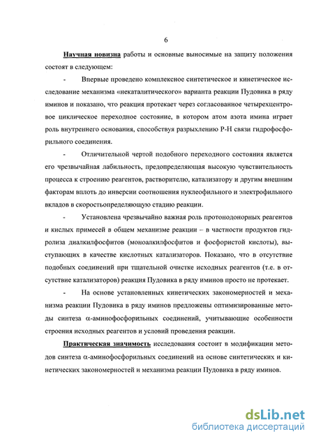 Впервые проведено комплексное синтетическое и кинетическое исследование механизма «некаталитического» варианта реакции Пудовика в ряду иминов и показано, что реакция протекает через согласованное четырехцентро-вое циклическое переходное состояние, в котором атом азота имина играет роль внутреннего основания, способствуя разрыхлению Р-Н связи гидрофосфо-рильного соединения.