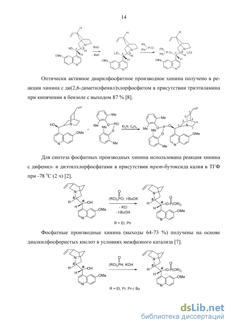 По данным ИК спектров и спектров ЯМР Н двойная связь хинина остается не затронутой в реакциях с 2,4-диарил-1,3,2,4-дитиадифосфетан-2,4-дисульфи-дами. В этих реакциях хинин ведёт себя как типичный спирт. Дитиофосфоновые кислоты (5а-г), образующиеся в этих реакциях и содержащие основный центр, превращаются в соли. Таким образом, на основе реакции 2 может быть открыт путь к новым дитиофосфоновым кислотам с фармакофорными хининовыми фрагментами.