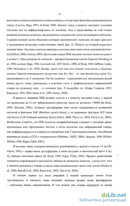 Процесс развития мужских половых клеток обычно подразделяют на три основных стадии развития: первая - период активного размножения и дифференцировки половых клеток - спсрматогонисв; вторая стадия - стадия роста и созревания половых клеток или мейоз; третья стадия - спермиогенез - процесс формирования мужских половых клеток (Рузен-Ранге, 1980; Райцина 1982в, 1985г; Захидов, 1998; Schulze et al., 1992; de Rooij, 1998, 2001; de Rooij, Russell, 2000; Luetjens et al., 2005).