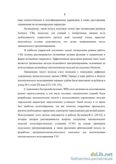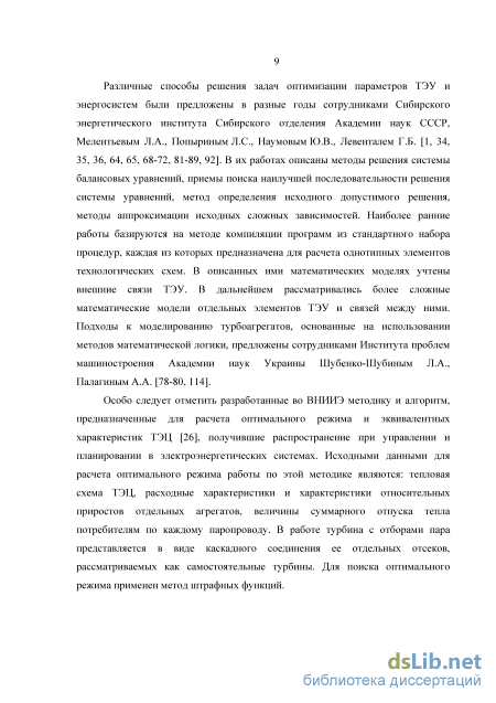 Современный уровень развития вычислительной техники позволил ставить и решать более сложные задачи математического моделирования и оптимизации режимов работы ТЭЦ. Значительный вклад был внесен сотрудниками Института систем энергетики им. Л.А. Мелентьева Сибирского отделения Российской академии наук (ИСЭМ СО РАН), Клером A.M., Декановой Н.П., Максимовым А.С, Степановой Е.Л. [27-29, 39-43, 45-51, 55-61, 67, 117, 124]. В их работах рассмотрены подробные модели ТЭС со сложными схемами.