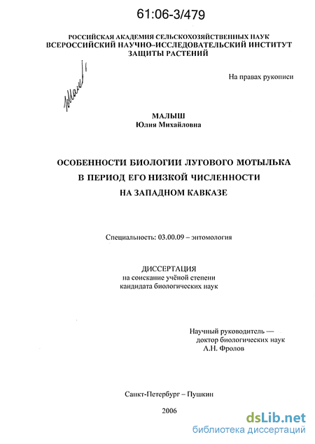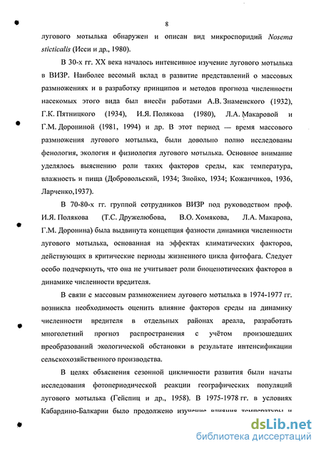 использованы материалы исследований, выполненных непосредственно автором, а также данные, полученные в ходе совместных исследований со специалистами ВИЗР - В.Б. Митрофановым, И.В. Исси, Ю.С. Токаревым и Г.Р. Леднёвым. Выражаю большую признательность всем перечисленным выше специалистам за работу, результаты которой отражены в совместных публикациях. Благодарю также В.Е. Гохмана (Ботсад МГУ, Москва), А.И. Халаима (ЗИМ, Санкт-Петербург) и В.И. Тобиаса (ЗИН, Санкт-Петербург) за определение видов паразитов лугового мотылька и С.А. Бахвалова (ИсиЭЖ СО РАН, Новосибирск) за консультационную поддержку по вопросам вирусологии. Выражаю благодарность коллективу НИЛ ВИЗР Сальского района Ростовской области во главе с заведующим A.M. Борискиным, в особенности научному сотруднику А.А. Звереву за организацию сбора имаго и гусениц лугового мотылька на полях п. Гигант. Благодарю В.И. Черкащина и М.П. Смирнову (Росфитоцентр МСХ РФ, Москва) и Л.И. Хомицкую (лаборатория диагностики и прогнозов Краснодарской краевой СТАЗР) за предоставленную возможность работать с отчётами станций. Особую благодарность выражаю своему руководителю А.Н. Фролову за помощь и консультации на всех этапах выполнении данной работы, коллективу лаборатории фитосанитарной диагностики и прогнозов и её руководителю И.Я. Гричанову, директору Славянского филиала ВИЗР В.М. Калинкину. За помощь в полевой и лабораторной работе выражаю признательность своей семье. За ценные критические замечания в процессе подготовки диссертации к печати благодарю И.В. Исси и Н.А. Вилкову (ВИЗР РАСХМ).