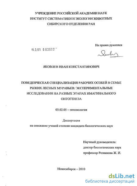 Полученные результаты приводят к новому взгляду на принципы организации семьи общественных насекомых, основанному на концепции сочетания поведенческой, когнитивной и социальной специализаций в сообществах животных, предложенной Ж.И. Резниковой (Reznikova, 2007): (1) поведенческая специализация в семье рыжих лесных муравьев основана на различиях в