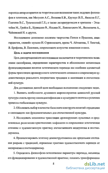 Цель диссертационного исследования заключается в теоретическом выявлении своеобразия, определении характеристик и обосновании механизмов функционирования понятия эстетического перехода как наиболее адекватной формы трансляции древнерусского эстетического сознания в современную художественную реальность посредством традиции и инновации в отечественной культуре.