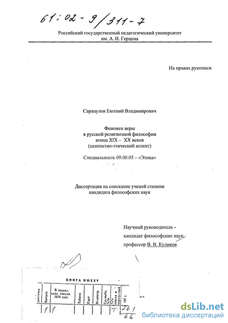 На основе этимологического анализа слова «вера» диссертант пытается проследить ее становление и развитие в русской культуре. Все это позволяет выявить специфику ценности веры, особенно ее этической окрашенности, в менталитете не только русского, но и в целом славянского народа.