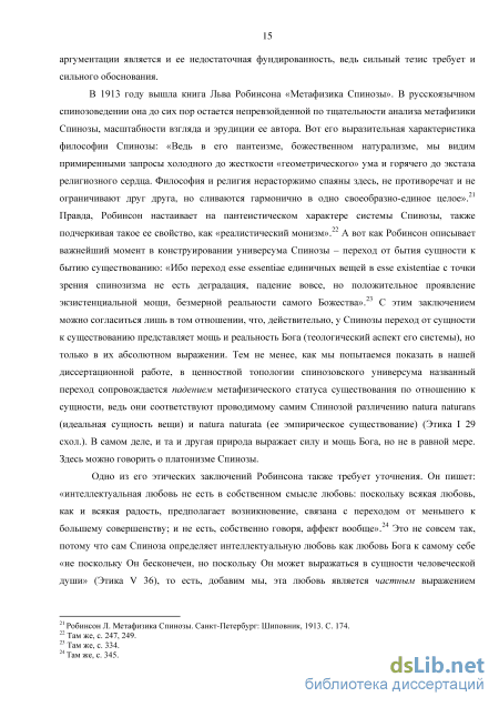 В 1913 году вышла книга Льва Робинсона «Метафизика Спинозы». В русскоязычном спинозоведении она до сих пор остается непревзойденной по тщательности анализа метафизики Спинозы, масштабности взгляда и эрудиции ее автора. Вот его выразительная характеристика философии Спинозы: «Ведь в его пантеизме, божественном натурализме, мы видим примиренными запросы холодного до жесткости «геометрического» ума и горячего до экстаза религиозного сердца. Философия и религия нерасторжимо спаяны здесь, не противоречат и не ограничивают друг друга, но сливаются гармонично в одно своеобразно-единое целое».21 Правда, Робинсон настаивает на пантеистическом характере системы Спинозы, также подчеркивая такое ее свойство, как «реалистический монизм».22 А вот как Робинсон описывает важнейший момент в конструировании универсума Спинозы – переход от бытия сущности к бытию существованию: «Ибо переход esse essentiae единичных вещей в esse existentiae с точки зрения спинозизма не есть деградация, падение вовсе, но положительное проявление экзистенциальной мощи, безмерной реальности самого Божества».23 С этим заключением можно согласиться лишь в том отношении, что, действительно, у Спинозы переход от сущности к существованию представляет мощь и реальность Бога (теологический аспект его системы), но только в их абсолютном выражении. Тем не менее, как мы попытаемся показать в нашей диссертационной работе, в ценностной топологии спинозовского универсума названный переход сопровождается падением метафизического статуса существования по отношению к сущности, ведь они соответствуют проводимому самим Спинозой различению natura naturans (идеальная сущность вещи) и natura naturata (ее эмпирическое существование) (Этика I 29 схол.). В самом деле, и та и другая природа выражает силу и мощь Бога, но не в равной мере. Здесь можно говорить о платонизме Спинозы.
