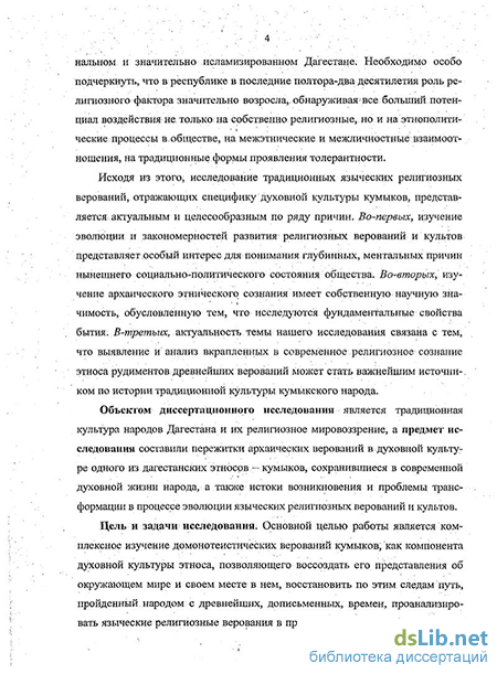 Объектом диссертационного исследования является традиционная культура народов Дагестана и их религиозное мировоззрение, а предмет исследования составили пережитки архаических верований в духовной культуре одного из дагестанских этносов – кумыков, сохранившиеся в современной духовной жизни народа, а также истоки возникновения и проблемы трансформации в процессе эволюции языческих религиозных верований и культов.