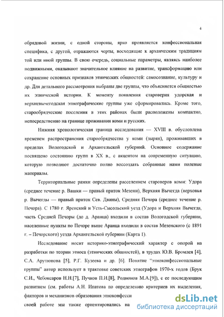 Исследование носит историко-этнографический характер с опорой на разработки по теории этноса (этнических общностей), в трудах Ю.В. Бромлея [4], С.А. Арутюнова [5], Р.Г. Кузеева и др. [6]. Понятие "этноконфессиональные группы" автор использует в трактовке советских этнографов 1970-х годов (Брук СИ., Чебоксаров Н.Н.[7], Пучков П.И.[8], Родионов M.A.[9])t с ее последующим развитием (см. работы А.Н. Ипатова по определению критериев их выделения, факторов и механизмов образования этноконфессиоиальных групп русских) [10]. В своей работе МЫ также ориентировались на современные исследования и теоретические обобщения по народному христианству / православию русских (М.М. Громыко [11], А.А. Панченко [12], Т.А. Бсрнштам [13] и др.); на работы по старообрядческой культуре русского и иноэтничного населения (А.Ф. Белоусов [14], СЕ. Никитина [15], О.М. Фишман [16], Г.Н. Чагин [17], А.А.Чувьюров [18]).