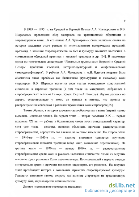 В 1993 — 1995 гг. на Средней и Верхней Печоре А.А. Чувьюровым и В.Э. Шараповым проводился сбор материала по традиционной обрядности и мировоззрению коми. На его основе А.А. Чувьюровым были написаны статьи по истории заселения этого региона (с использованием исторических преданий, прозвищ), о влиянии старообрядчества на быт и культуру местного населения, о соотношении обрядовой практики и книжной традиции и др. [64]. В настоящее время им подготовлена диссертация *'Локальные группы коми Верхней и Средней Печоры: проблемы языковой, историко-культурной и конфессиональной самоидентификации". В работах А.А. Чувьюрова и А.Н. Власова впервые была обозначена такая проблема как билингвизм (культурный и языковой) коми староверов. В.Э. Шарапов посвятил свои статьи осмыслению христианской символики в народной традиции (в том числе на материалах, собранных в старообрядческих селах на Печоре, Удоре, Верхней Вычегде). Изучив роспись но дереву, существующую у коми, он пришел к выводу, что ареалы ее распространения совпадают с районами проживания коми староверов [65].