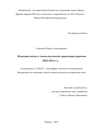 В диссертационном исследовании была поставлена цель выявить этносоциальные особенности речевого поведения и языковых ориентации русского, украинского и крымскотатарского населения Крыма в 2013-2014 гг., а также определить роль реальной языковой жизни крымчан в развитии этнополитической ситуации на полуострове. Векторы языкового поведения крымчан было сформированы под влиянием исторически сложившейся этнической картины данного региона. По данным Всеукраинской переписи 2001 года русское население составляло основной массив населения полуострова - 60,1%, тогда как доля украинцев 23,9%. Крымскотатарское население третье по численности с удельным весом 10,2%. Несмотря на то, что Крым на протяжении более чем 60 лет находился в составе Украины, русские сохранили численное преобладание на полуострове и с точки зрения этнического состава Крым может быть назван русской территорией.