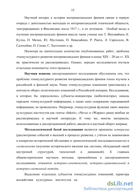 Практическая часть диссертационного исследования, посвященная этнокультурному развитию ингерманландских финнов, формировалась на базе работ отечественных и зарубежных исследователей.