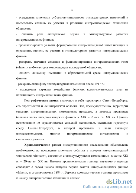 Хронологические рамки диссертационного исследования обусловлены необходимостью проследить ключевые события в истории ингерманландской этнической общности, связанные с этнокультурными изменениями в конце XIX в. – 20-ые гг. XX вв. Нижняя хронологическая граница изучаемого периода совпадает с годом начала выпуска первой газеты ингерманландских финнов «Inkeri», которая ограничивается 1884 г. Верхняя хронологическая граница примыкает к началу антирелигиозной кампании и коллективизации в СССР в конце 1920-ых гг. Стоит отметить, что многие события, ставшие причинами этнокультурных изменений, произошли раньше 1884 г. Например, рост количества общественных организаций, инициация выпуска ингерманландских газет и др. события связанны с деятельность ингерманландских интеллигентов,