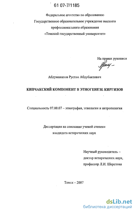Актуальность темы. Работа посвящена проблеме участия кипчакского компонента в этногенезе киргизов - этноса, в настоящее время населяющего территории горных систем Тянь-Шаня и Памира. Этногенез киргизов, несмотря на то, что ученые изучают его уже на протяжении почти двух веков, является одним из самых спорных моментов в современном тюрковедении. В последние десятилетия возникновение целого ряда суверенных национальных государств на обломках Советского Союза актуализировало интерес этносов к своему прошлому, в том числе к своему происхождению. Как известно, интерес к своей истории, происхождению, очень сильно политизирован, именно поэтому в последнее время появилось множество работ по истории Центральной Азии, которые имеют к исторической науке лишь опосредованное отношение, всячески возвеличивая и удревняя историю тех или иных государствообразующих этносов, активно используют этноисторические спекуляции. Данное исследование, затрагивающее этнические процессы в Евразии на протяжении двух тысячелетий сквозь призму этногенеза киргизов, рассматривает проблему участия в этногенезе киргизов кипчакского компонента.