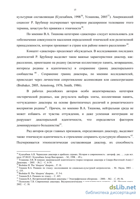 В работах российских авторов особо акцентировалась категория «исторической родины», как результата выбора элиты, коллективная память, «отчуждение» диаспоры на основе фенотипичных различий и романтического восприятия родины . Причем, по мнению В.А. Тишкова, нейтральная среда не может избавить от чувства отчуждения, и даже успешная интеграция не разрушает диаспоральной идентичности, что определяется фактором доминирующего большинства .