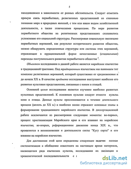 Основной целью исследования является изучение наиболее развитых культовых представлений. К основным культам следует отнести культы, коня и птицы. Данные культы прослеживаются в течение длительного времени (вплоть до XX в.) и наиболее полно отражают основные этапы в формировании традиционного марийского язычества. В диссертационной работе исключаются из рассмотрения следующие моменты: во-первых, процесс христианизации Марийского края и его влияние на марийское язычество; во-вторых, реформационное движение конца XIX в., что проявляется в возникновении и деятельности секты "Кугу сорта" и его влияние на марийское язычество.