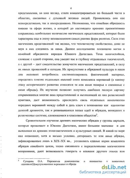 представления, на наш взгляд, стали концентрироваться по большей части в областях, связанных с духовной жизнью людей. Проявлялись они как непосредственно, так и опосредованно. Несомненно, что семейная обрядносіь именно та сфера жизни, в которой до настоящего времени презентативно сохранилось наибольшее количество магических представлений, которые были характерны еще в эпоху возникновения самых ранних форм религии. Сила этих магических представлений так велика, что человечеству свойственно, даже не веря в них следовать за ними. Данное исследование посвящено магии в семейной обрядности народов Южного Дагестана. Тема многослойная, сложная: с одной стороны, она уводит нас в глубину отдаленных тысячелетий, а с другой - дает свидетельство живучести магических представлений, в силу их явных проявлений и сегодня. Их присутствие в обрядовой культуре в наши дни вызывает потребность систематизировать фактический материал, определить генезис отдельных явлений этого комплекса верований (к какому этапу исторического развития относятся те или иные поверья и связанные с ними обряды). Рік изучение позволит получить наиболее полную картину сохранившихся многие века представлений и вытекающей из них религиозной практики, даст возможность проследить связь отдельных компонентов народных верований между собой и дать ключ к пониманию как идеологии далекой древности, так и развивавшихся позже идей и обрядов, вошедших в религиозные системы, сложившиеся в классовом обществе5.