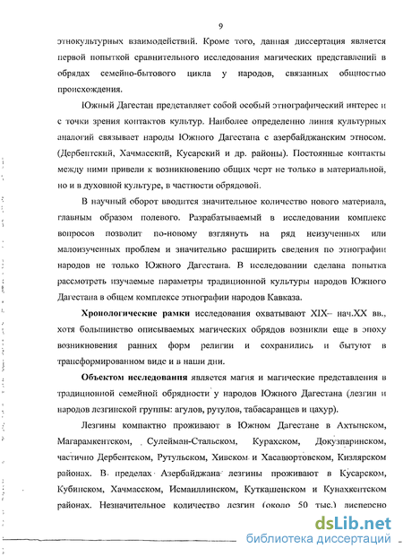 Объектом исследования является магия и магические представления в традиционной семейной обрядности у народов Южного Дагестана (лезгин и народов лезгинской группы: агулов, рутулов, табасаранцев и цахур).