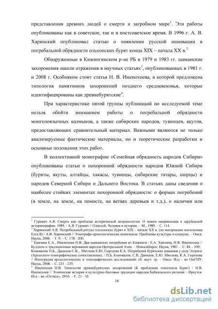 Дьяконова В.П. Погребальный обряд тувинцев как историко-этнографический источник / В.П. Дьяконова. - Л: Наука, 1975. - 163 с; Бравина Р.И., Попов В.В. Погребально-поминальная обрядность якутов: памятники и традиции (XV - XIX вв.) / Р.И. Бравина, В.В. Попов. - Новосибирск: Наука, 1992. - 242 с. источников обусловлен также тем, что на исследуемой территории почти не сохранилось вещественных погребальных памятников, которые можно было бы как-то изучить с целью получения научных сведений. Литературные источники можно характеризовать как достаточно достоверные, ибо они взяты из работ известных авторитетных исследователей, многие из которых являлись личными свидетелями описываемых событий или осуществляли специальный сбор материалов.