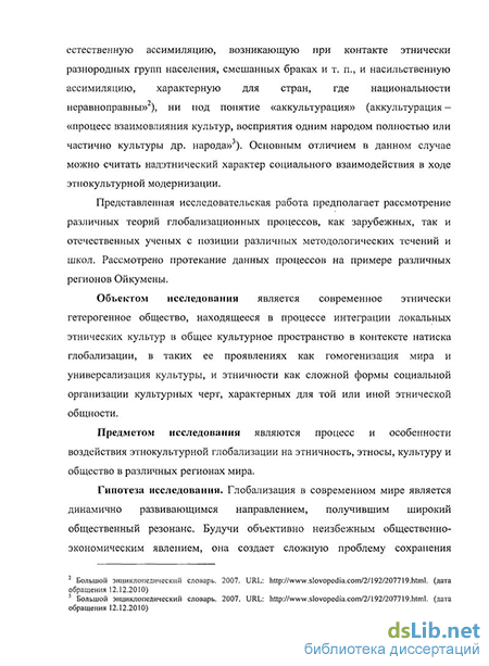 Предмет исследования - процесс и особенности воздействия этнокультурной глобализации на этничность, этносы, культуру и общество в различных регионах мира.