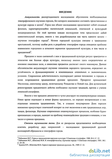 Степень изученности темы. Для ее раскрытия в работе освещены два направления исследований - традиционная русская календарная обрядность и этнография города.