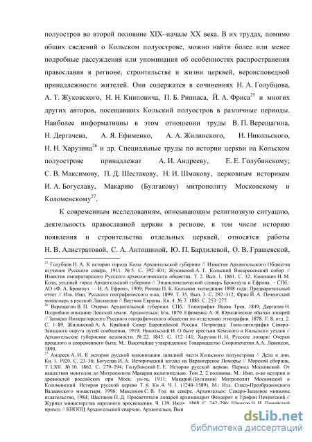 Й. А. Фриса и многих других. Наиболее информативны в этом отношении тексты В. П. Верещагина, Н. Дергачева, А. Я. Ефименко, А. А. Жилинского, И. Никольского, Н. Н. Харузина и др. Специальные труды по истории церкви на Кольском полуострове принадлежат А. И. Андрееву, Е. Е. Голубинскому, С. В. Максимову, П. Д. Шестакову, Н. И. Шмакову, церковным историкам И. А. Богуславу, Макарию (Булгакову) митрополиту Московскому и Коломенскому.