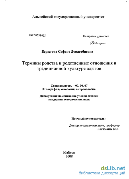 Важной вехой в исследовании семейно-родственных отношений адыгов явились опубликованные в конце 40-х — начале 50-х годов прошлого века статьи Е.Н.Студенецкой6, в которой на большом конкретном материале рассматриваются особенности быта, культуры, болыпесемейной организации кабардинцев. Вслед за этим была написана диссертация Т.Т.Шиковой , продолжающая работу начатую А.М.Ладыженским и Е.Н. Студенецкой.