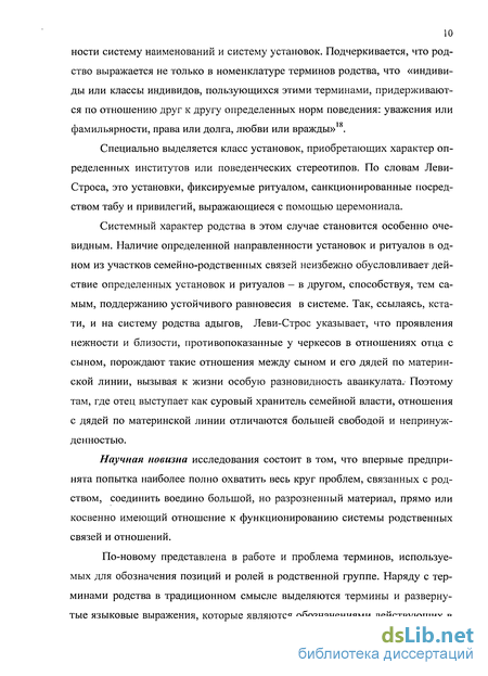 Научная новизна исследования состоит в том, что впервые предпринята попытка наиболее полно охватить весь круг проблем, связанных с родством, соединить воедино большой, но разрозненный материал, прямо или косвенно имеющий отношение к функционированию системы родственных связей и отношений.