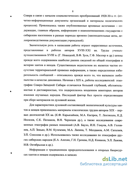 Для характеристики духовной составляющей экологической культуры хантов и ненцев привлекались материалы классических трудов авторов XIX - первых десятилетий XX вв. (К.Ф. Карьялайнен, М.А. Кастрен, Т. Лехтисало, К.Д. Носилов, С.К. Патканов, В.Н. Чернецов др.), а также исследования современных этнографов разных поколений (А.В. Баул о, И.Н. Гему ев, А.В. Голов-нев, А.П. Зенько, В.М. Кулемзин, М.А. Лапина, Т. Молданов, A.M. Сагалаев, З.П. Соколова и др.). Использовались также исследования по этнографии других сибирских народов (К.А. Алехин, Г.Н. Грачева, Н.Д. Конаков, Э.Л. Львова, И.В. Октябрьская и др.).