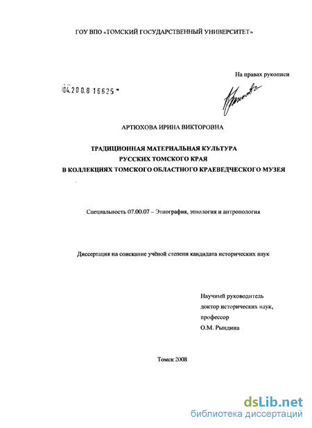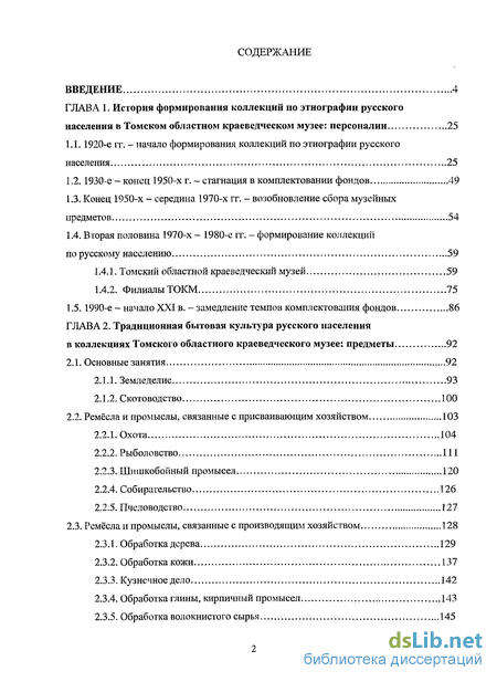 Структура. Диссертация состоит из введения, двух глав, посвященных истории формирования этнографических коллекций ТОКМ по традиционной культуре русских и анализу их информативной ёмкости, заключения, списка использованных источников и литературы, приложений.