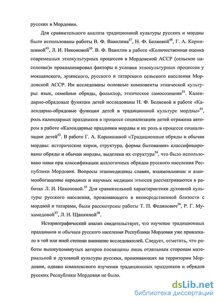 Для сравнительного анализа традиционной культуры русских и мордвы были использованы работы В. Ф. Вавилина47, Н. Ф. Беляевой48, Г. А. Корнишиной49, Л. И. Никоновой50. В. Ф. Вавилин в работе «Количественная оценка современных этнокультурных процессов в Мордовской АССР (сельское население)» проанализировал факторы и условия этнокультурных процессов у мокшанского, эрзянского, русского и татарского сельского населения Мордовской АССР. Им исследованы основные компоненты этнической культуры: язык, семейные обряды, фольклор, этническое самосознание51. Кален-дарно-обрядовые функции детей исследованы Н. Ф. Беляевой в работе «Ка-лендарно-обрядовые функции детей в традиционной культуре мордвы»52, роль календарных праздников в процессе социализации детей отражена автором в работе «Календарные праздники мордвы и их роль в процессе социали-зации детей . В работе Г. А. Корнишиной «Традиционные обряды и обычаи мордвы: исторические корни, структура, формы бытования» классифицированы обряды и обычаи мордвы, выделена их структура54, что было использовано нами при классификации аналогичных обрядов русского населения Республики Мордовия. Вопросы этномедицины славян, взаимовлияние и взаимообогащение народных и научных медицин этносов рассматриваются в работах Л. И. Никоновой.55 Для сравнительной характеристики духовной культуры русского населения, проживающего в непосредственной близости с мордвой и татарами, были рассмотрены работы Т. П. Федянович56, Р. Г. Му-хамедовой57, Л. Н. Щанкиной58.