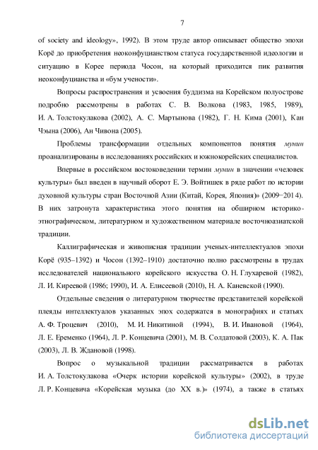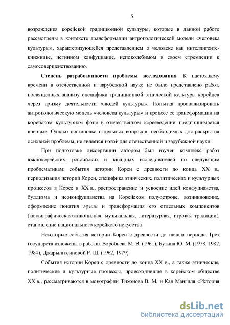 Степень изученности проблемы. Данное исследование во многом опирается на работы российских, западных и южнокорейских авторов, написанные в разное время по ряду актуальных проблем: события истории Кореи с древности до конца XX в., периодизация истории Кореи, специфика этнических, политических и культурных процессов в Корее в XX в., распространение и усвоение идей конфуцианства, буддизма и неоконфуцианства на Корейском полуострове, возникновение, оформление понятия мунин и трансформация его отдельных компонентов (каллиграфическая/живописная, музыкальная, литературная, игровая традиции), становление национального корейского искусства.