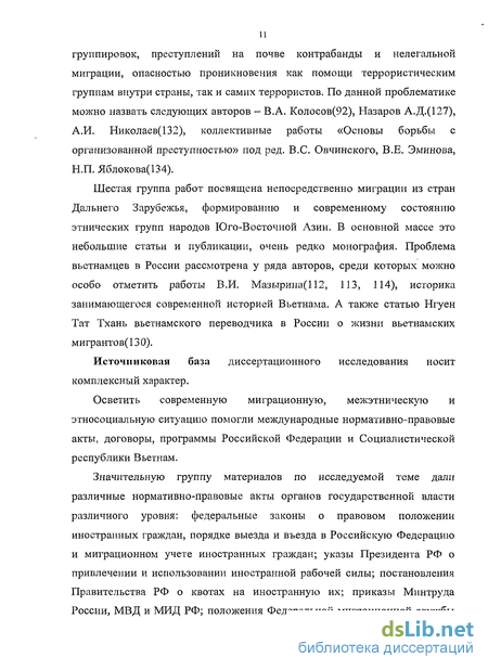 11 группировок, преступлений на почве контрабанды и нелегальной миграции, опасностью проникновения как помощи террористическим группам внутри страны, так и самих террористов. По данной проблематике можно назвать следующих авторов - В.А. Колосов(92), Назаров А.Д.(127), А.И. Николаев(132), коллективные работы «Основы борьбы с организованной преступностью» под ред. B.C. Овчинского, В.Е. Эминова, Н.П. Яблокова(134).