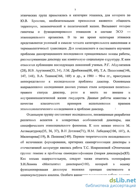 Отдельную группу составляют исследования, посвященные разработке различных аспектов и конкретных особенностей диаспоры, как специфического этносоциального феномена. К ним можно отнести М. Аствацатурову(35, 36, 37), В.И Дятлова(71), Н.М. Лебедеву(106, 107), А. Милитарева(119), В. Попкова(149). Первым теоретическим исследованием об источниках формирования, критериях самоорганизации диаспоры в отечественной литературе явилась работа Т.С. Иларионовой «Этническая группа: генезис и проблемы самоидентификации (теория диаспоры)»(83). Как весьма содержательную, следует также отметить монографию З.И.Левина «Менталитет диаспоры»(108), который в основу функционирования диаспоры положил принцип системного и социокультурного анализа. Особого внимания заслуживает работа доктора
