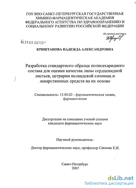 Целью настоящей диссертационной работы явилась разработка стандартного образца на основе полисахаридных комплексов цетрарии исландской слоевищ и липы сердцевидной листьев и методов стандартизации этих растительных объектов, а также их лекарственных средств с применением полученного образца