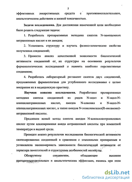 Основой для пополнения арсенала лекарственных препаратов является синтез веществ, обладающих высокой активностью и малой токсичностью. Поиск, изучение и внедрение в клиническую практику относительно безвредных препаратов является одной из основных задач фармацевтической химии. В этом направлении особый интерес представляют производные N-замещенной антраниловой кислоты, в связи с их низкой токсичностью и многогранностью биологических эффектов, а именно, наличии противовоспалительного и анальгетического действия.