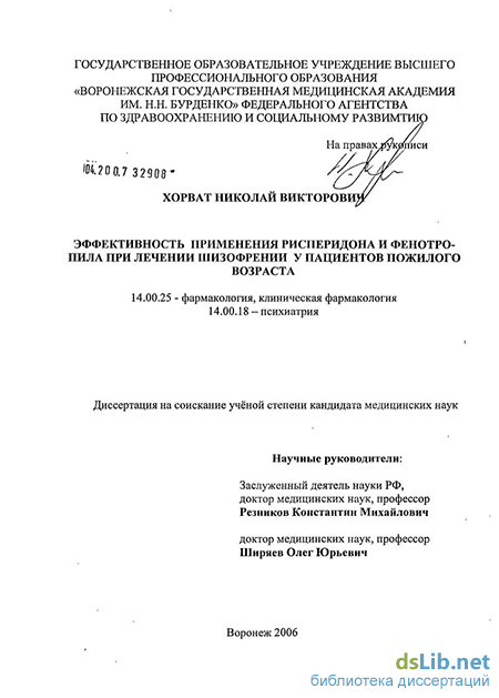 Хорват Николай Викторович. Эффективность применения рисперидона и фенотропила при лечении шизофрении у пациентов пожилого возраста : диссертация ... кандидата медицинских наук : 14.00.25 / Хорват Николай Викторович; [Место защиты: ГОУВПО "Курский государственный медицинский университет"].- Курск, 2006.- 148 с.: ил.