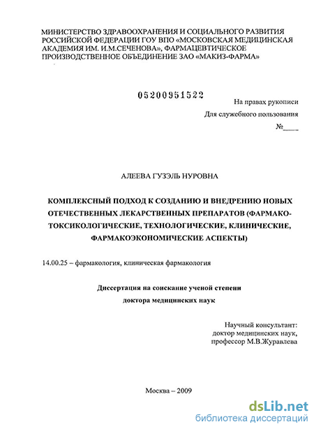Алеева Гузэль Нуровна. Комплексный подход к созданию и внедрению новых отечественных лекарственных препаратов (фармако-токсикологические, технологические, клинические, фармакоэкономические аспекты) : диссертация ... доктора медицинских наук : 14.00.25 / Алеева Гузэль Нуровна; [Место защиты: ГОУВПО "Московская медицинская академия"].- Москва, 2009.- 321 с.: ил.