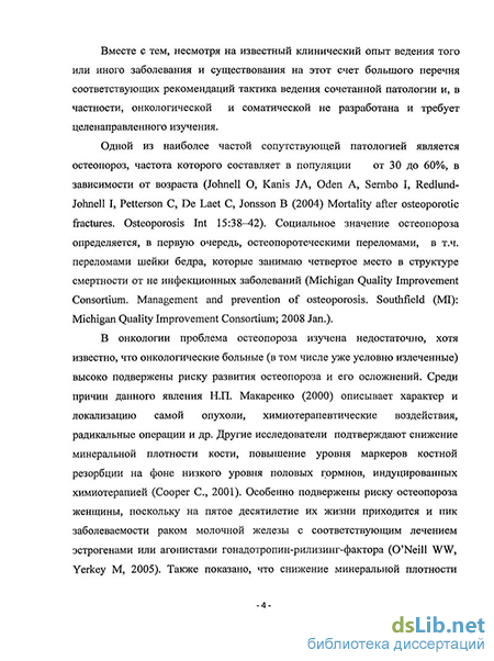 Таким образом, приведенные немногочисленные сведения позволяют предполагать значительную распространенность остеопороза у онкологических больных. Однако, целенаправленных работ в этом направлении не проводилось, не исследованы факторы риска остеопороза, не выявлена взаимосвязь между локализацией опухолей и МПК, не определено место и эффективность остеопоретической терапии при комплексной терапии онкологических больных.