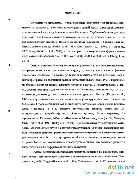 Актуальность проблемы. Фундаментальной проблемой теоретической фармакологии является установление закономерных связей между структурой химических соединений и их воздействием на живой организм. Удобным объектом для анализа таких связей могут служить пектиновые вещества, представляющие интерес и как потенциальный источник новых лекарственных препаратов и биологически активных добавок к пище (Thakur et al., 1997; Хотимченко и др., 2001а, б; Sun et al., 2002; Nangia-Makker et al., 2002), и как материал для современных фармацевтических технологий (Miyazaki et al., 2000; Semde et al., 2000; Liu et al., 2003; Cheng, Lim, 2004).