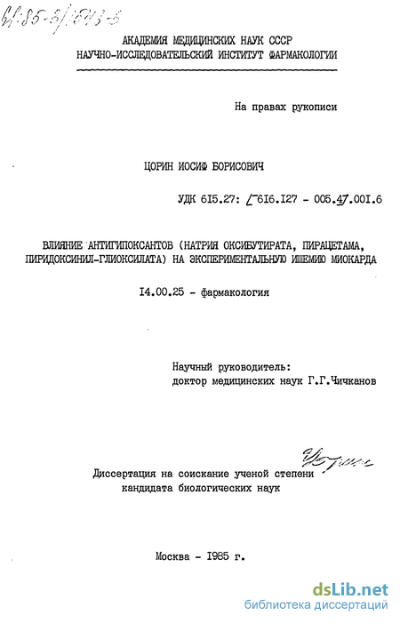 Приведенные соображения свидетельствуют об актуальности доклинического изучения противоишемического действия антигипок сайтов. Этой важной проблеме и посвящена настоящая работа, которая выполнялась в рамках программы 0.69.01 ПЭДГ СССР "Разработать методы и средства профилактики, диагностики и лечения основных заболеваний сердечно-сосудистой системы на основе современных достижений в области изучения этиологии и патогенеза этих заболеваний" и плановой темы НИР Института фармакологии АМН СССР, № госрегистрации 80078597.