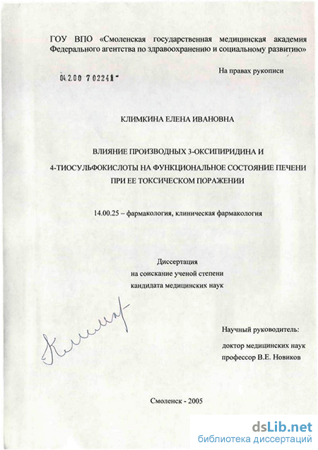 Климкина Елена Ивановна. Влияние производных 3-оксипиридина и 4-тиосульфокислоты на функциональное состояние печени при ее токсическом поражении : диссертация ... кандидата медицинских наук : 14.00.25 / Климкина Елена Ивановна; [Место защиты: ГОУВПО "Смоленская государственная медицинская академия"].- Смоленск, 2006.- 0 с.: ил.